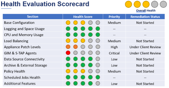 Following our assessment, a detailed Guardium Health Evaluation Report is provided. A key component of this report is the Executive Health Evaluation Scorecard. This scorecard offers a comprehensive, easy-to-understand overview of your Guardium deployment’s health. It highlights areas for improvement, delivers the actionable insights you need to drive progress, and provides a clear high-level remediation status to track progress.