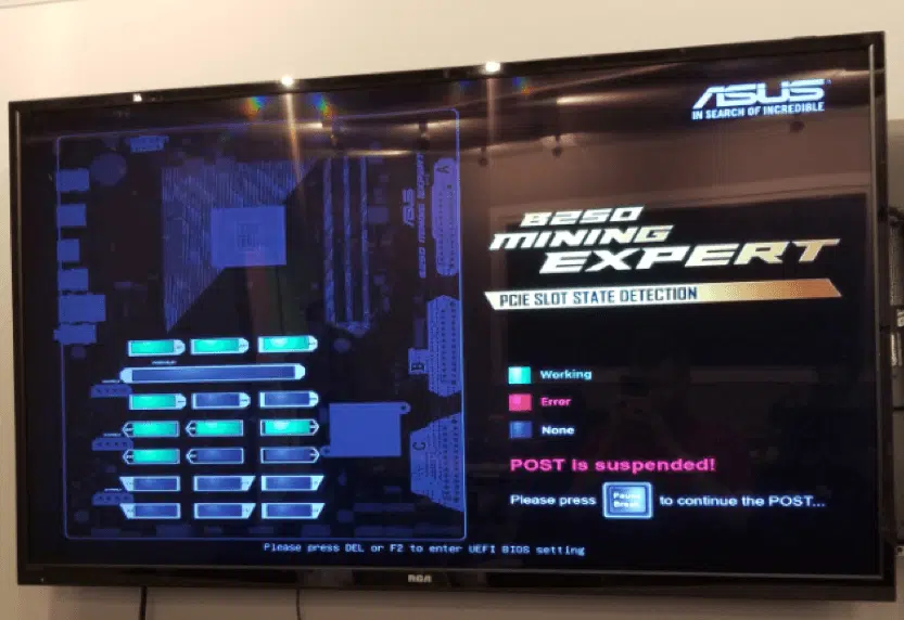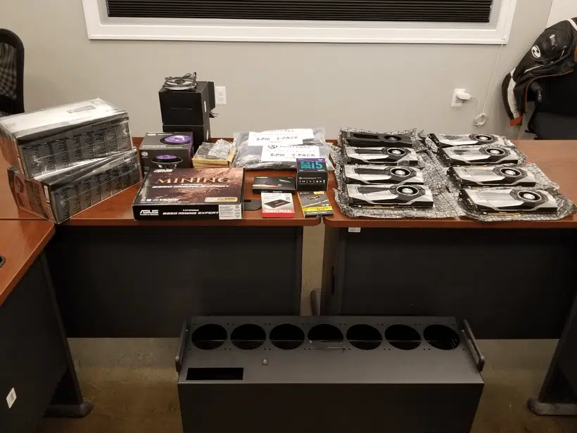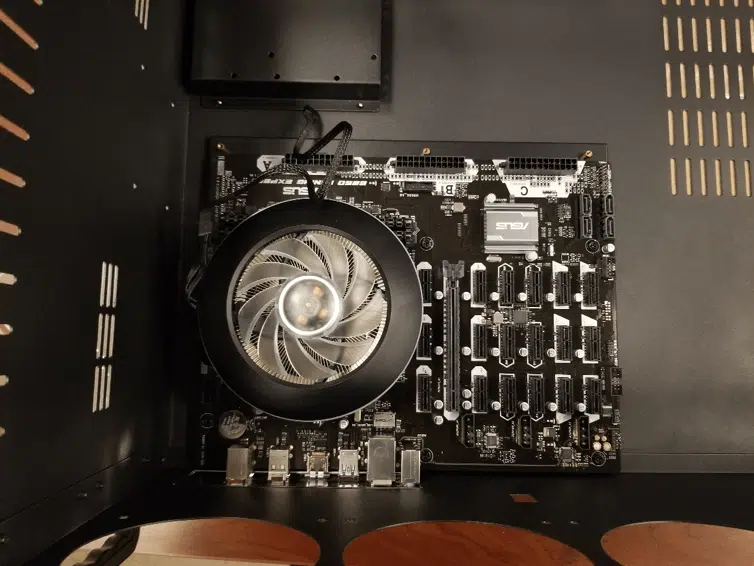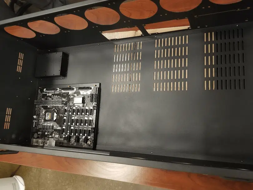 The hydra server style case and ASUS Mining board allowed for future expansion, with the case holding up the 13 cards and the boards have 19 PCI ports.